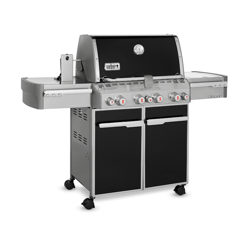 Weber Summit® E-470, 4 brülör, sear istasyonu, döner şiş, tütsü brülörü ve yan ocakla steak, brisket, pizza ve tavuk aynı anda pişirir. 68×44 cm ızgaraya 24 burger sığar; çift duvarlı paslanmaz kapak ısıyı korur, temizliği kolaydır. Profesyonel barbekü deneyimi Summit kalitesinde!